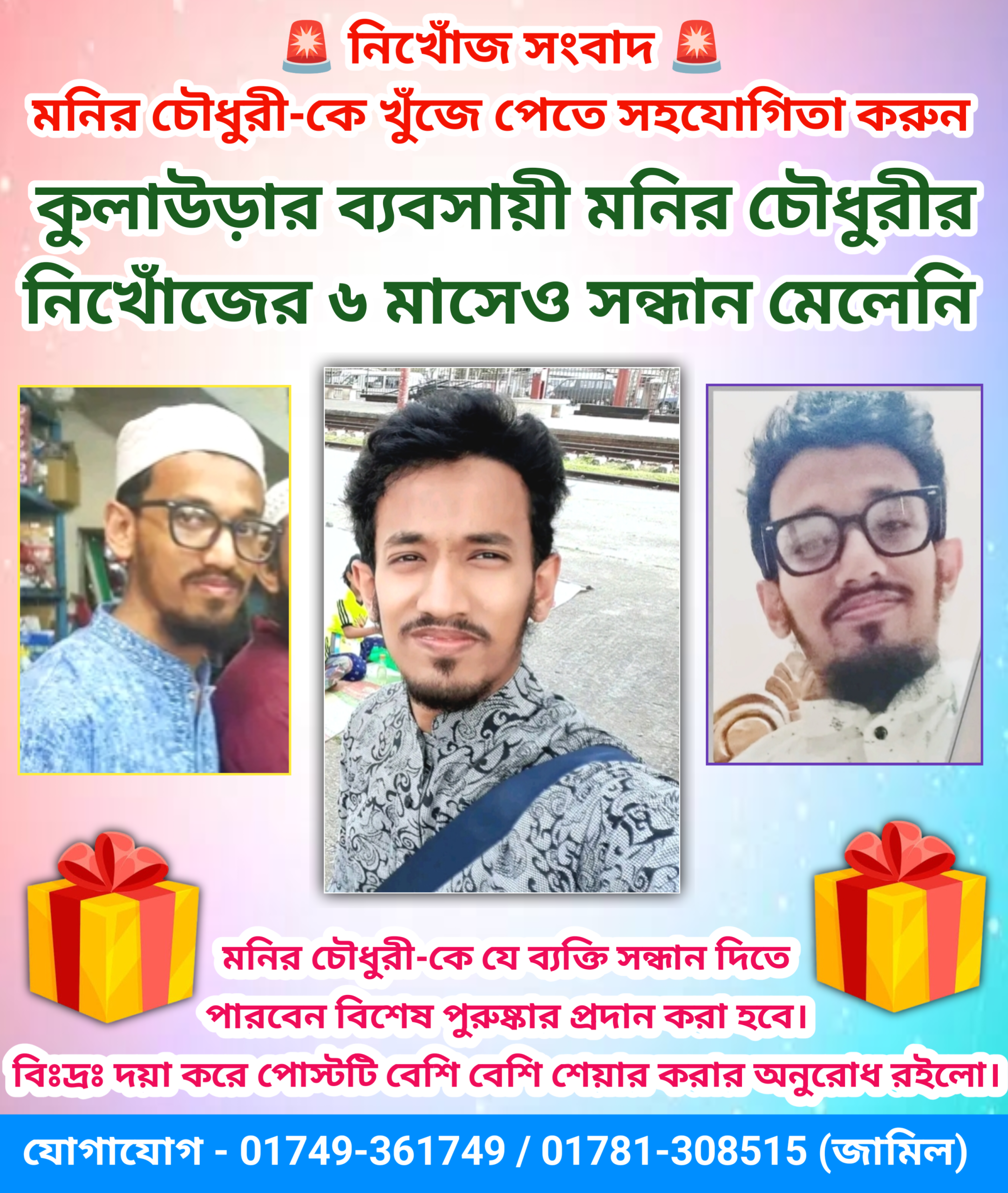 কুলাউড়ার ব্যবসায়ী মনির চৌধুরীর নিখোঁজের ৬ মাসেও সন্ধান মেলেনি নিজস্ব প্রতিবেদক: মৌলভীবাজারের কুলাউড়া উপজেলার পূর্ব মনসুর এলাকার বাসিন্দা ও উত্তর বাজারের সাবেক ব্যবসায়ী মনির চৌধুরী নিখোঁজ হওয়ার প্রায় ছয় মাস পেরিয়ে গেলেও এখনো তার কোনো সন্ধান পাওয়া যায়নি। এতে পরিবার ও স্বজনদের মাঝে চরম উদ্বেগ ও উৎকণ্ঠা বিরাজ করছে। পরিবার Details..