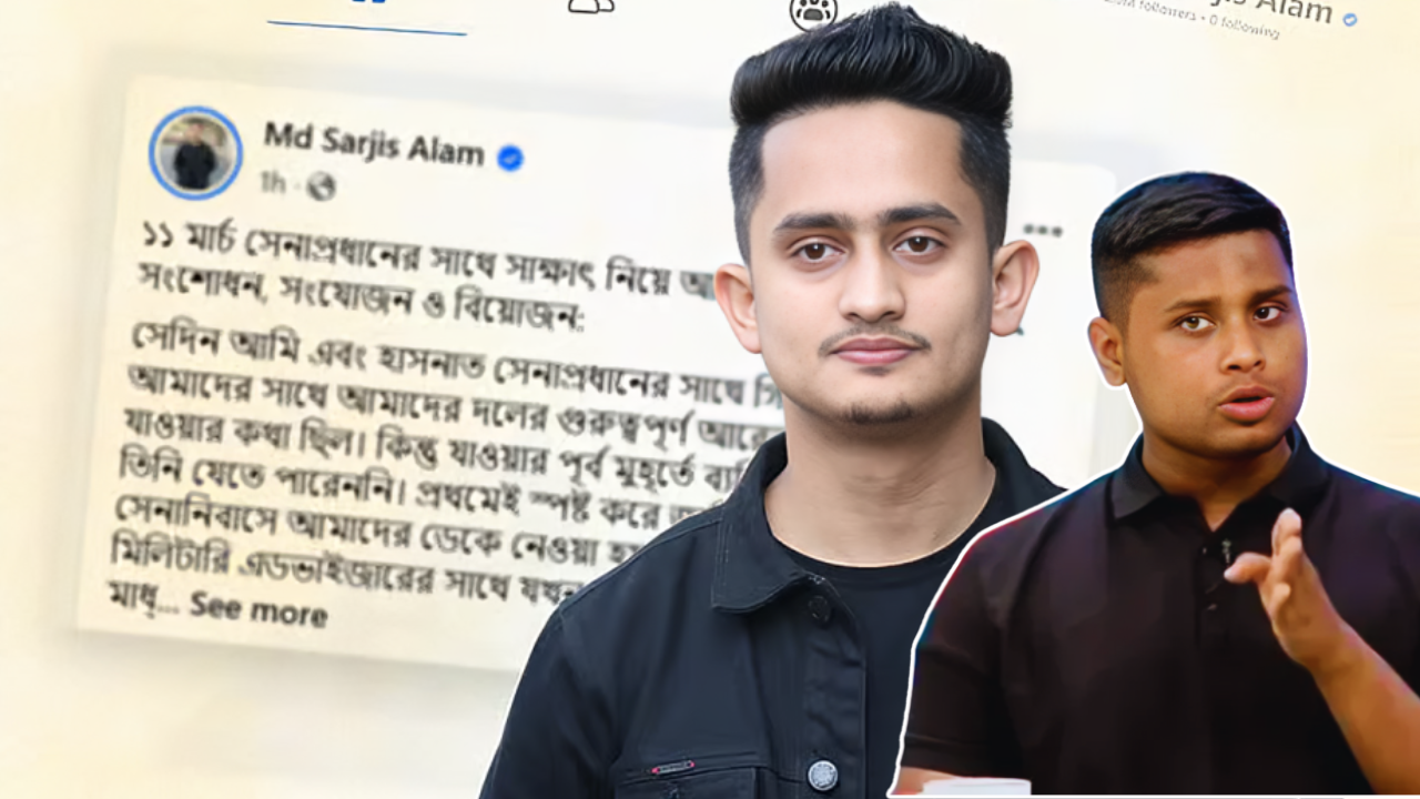 রবিবার (২৩ মার্চ) দুপুরে নিজের ভেরিফায়েড ফেসবুক অ্যাকাউন্টে এক দীর্ঘ স্ট্যাটাসে সারজিস জানান, সেনাপ্রধানের সঙ্গে তাদের আলোচনাটি এক ধরনের ‘অভিমত বিনিময়’ ছিল, কোনো ‘প্রস্তাব’ নয়।