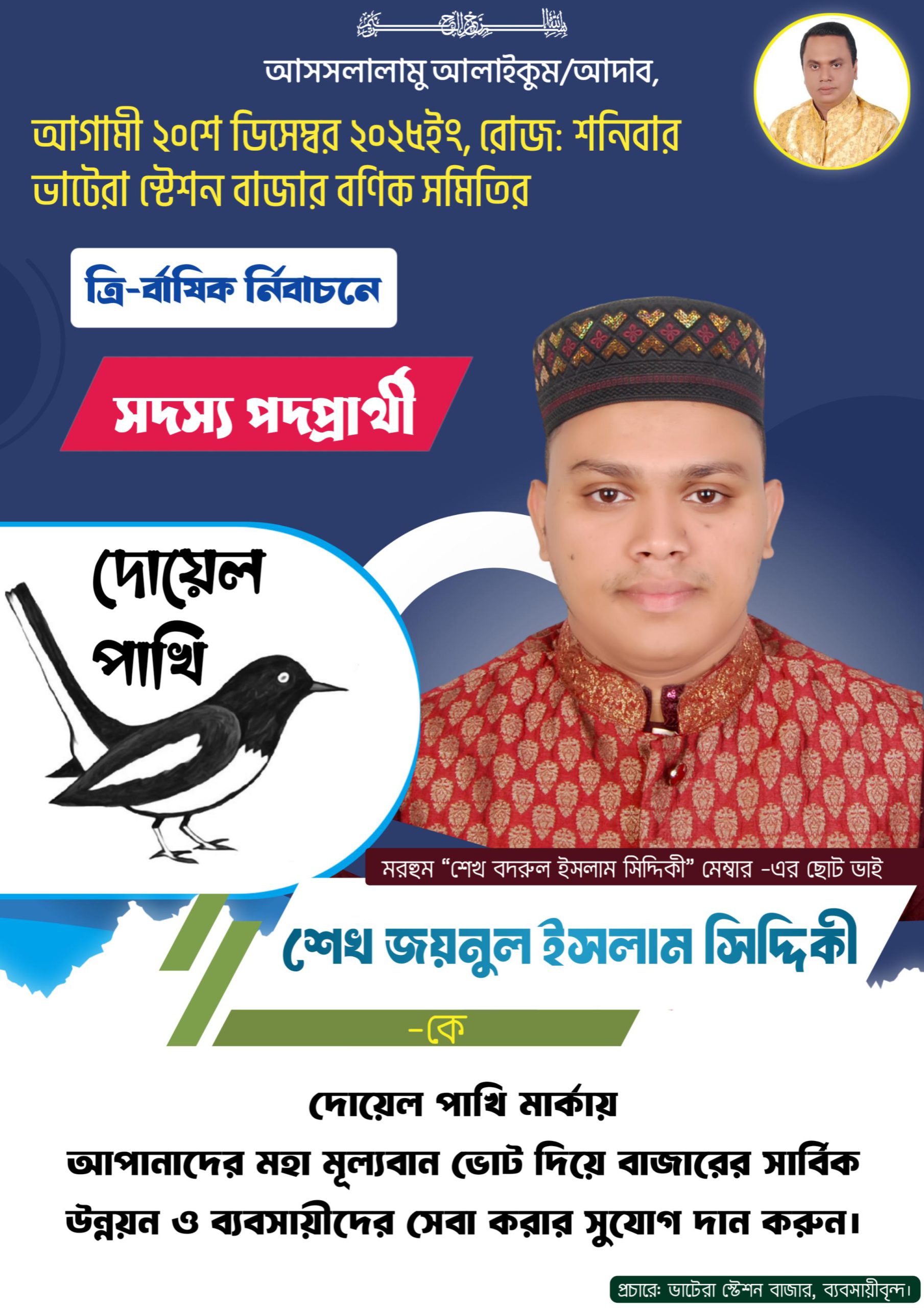 ভাটেরা স্টেশন বাজার বণিক সমিতির ত্রিবার্ষিক নির্বাচনে সবচেয়ে কনিষ্ঠ তরুণ প্রার্থী শেখ জয়নুল ইসলাম সিদ্দিকীর ভোট ও দোয়া প্রার্থনা